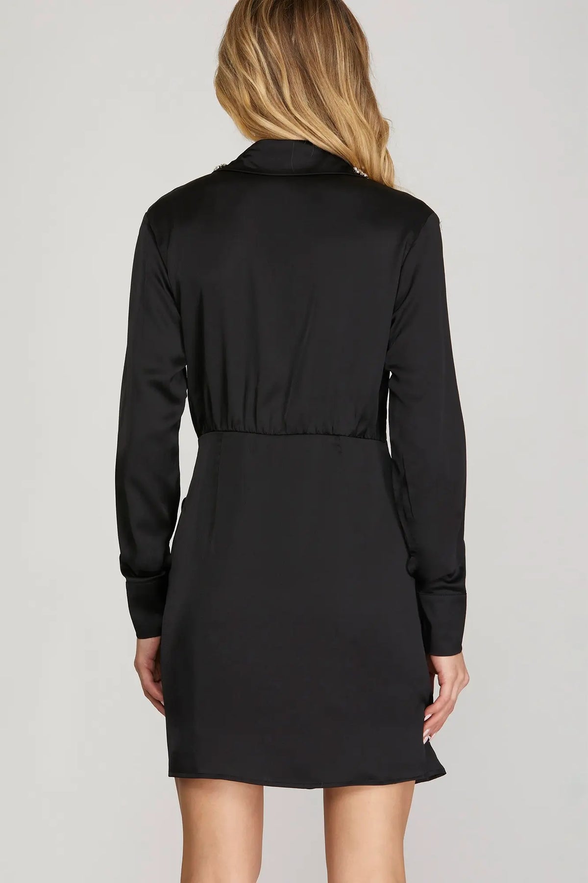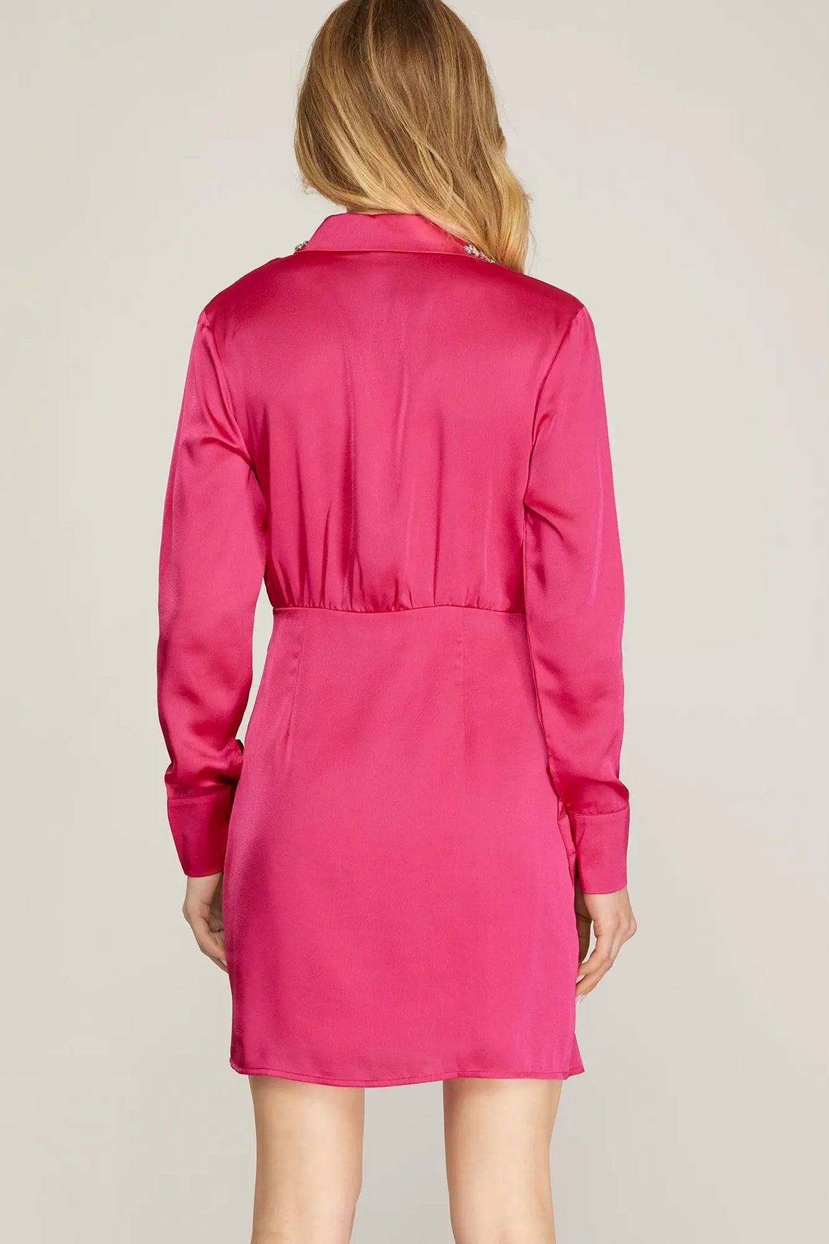 Elevate your style with this long sleeve satin dress featuring a sparkling rhinestone collar and a flirty wrap skirt. Designed to turn heads, its smooth satin finish adds a touch of luxury while the rhinestone collar brings playful glamour. The wrap skirt flatters every figure, making it perfect for day-to-night occasions. Stand out effortlessly—just like the 5'8" model showing off this chic look.