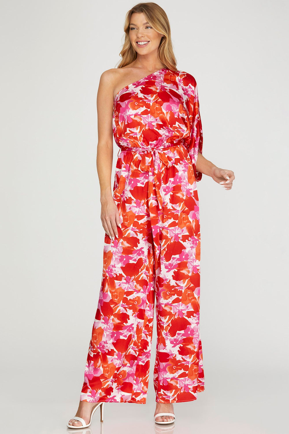 ONE SHOULDER PRINT WOVEN JUMPSUIT WITH FRONT TIE