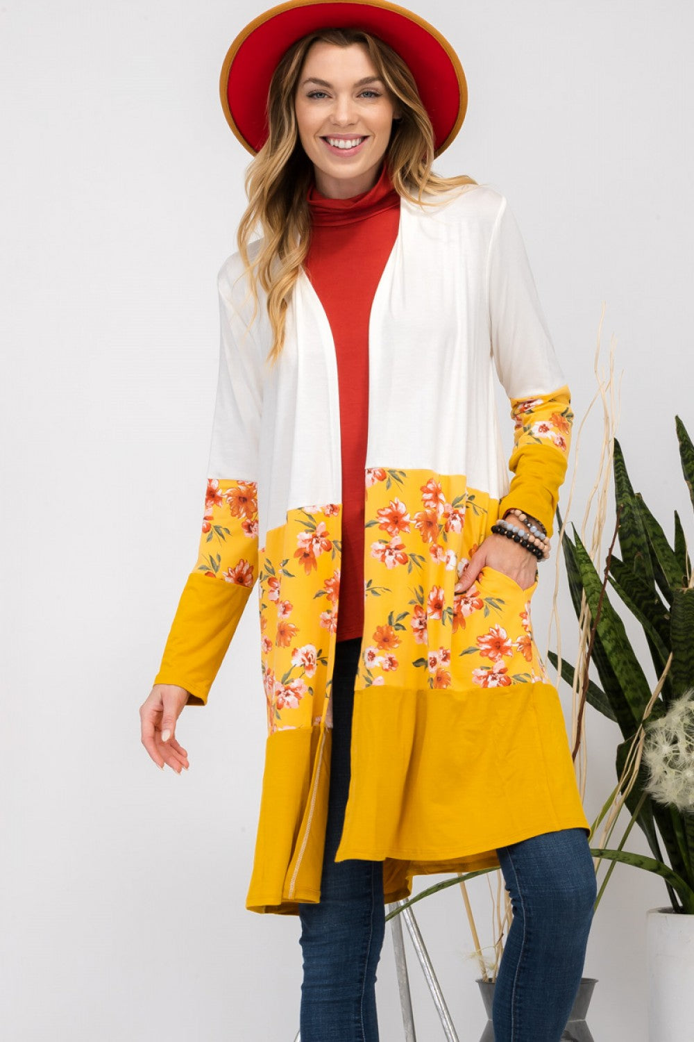 IVORY/MUSTARD FLORAL AND SOLID COLOR BLOCK CARDIGAN-CLCT43532I-PL
