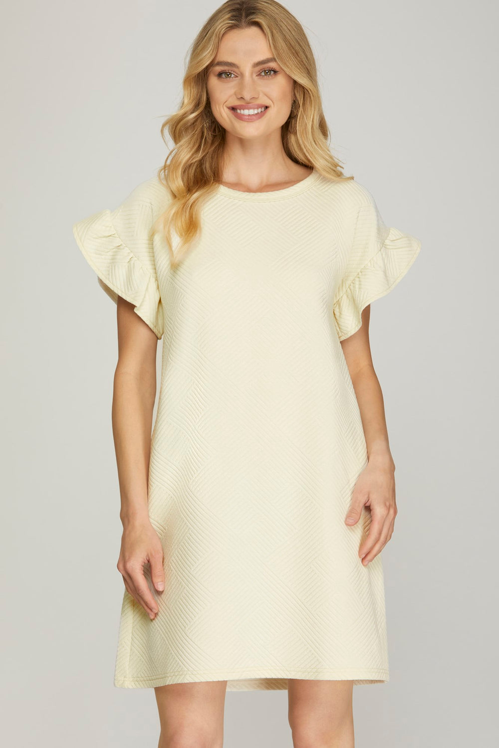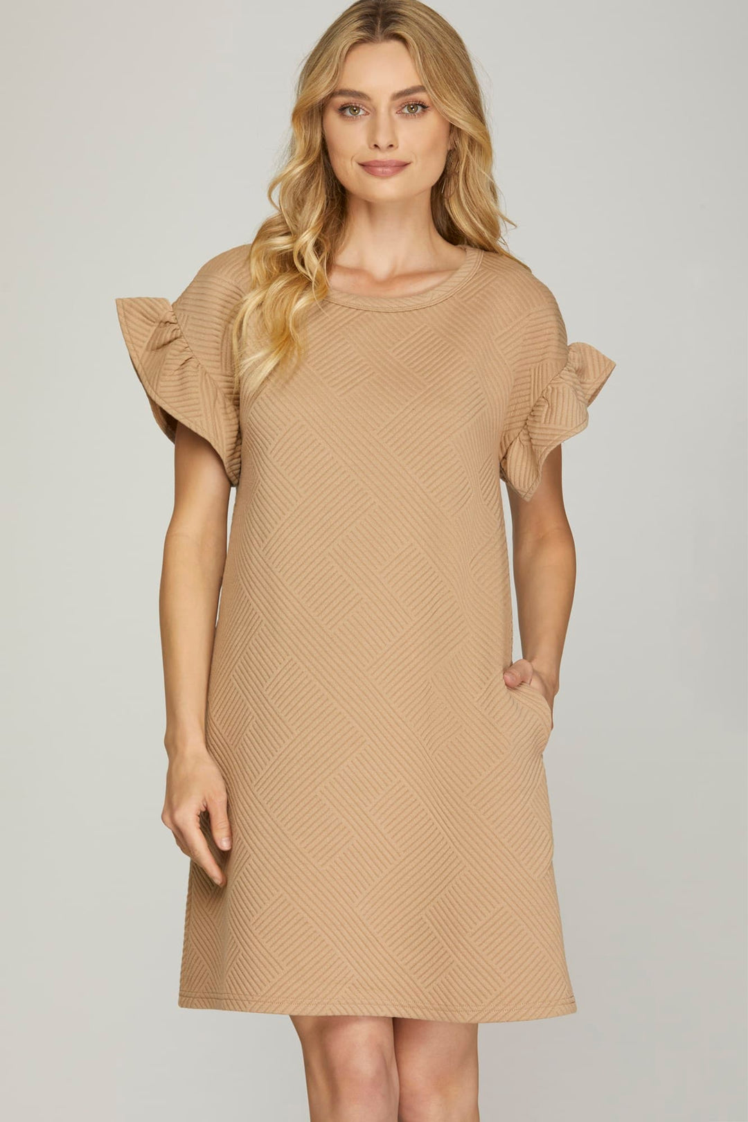 RUFFLED SLEEVE QUILTED KNIT DRESS WITH SIDE POCKET-SKSY7072