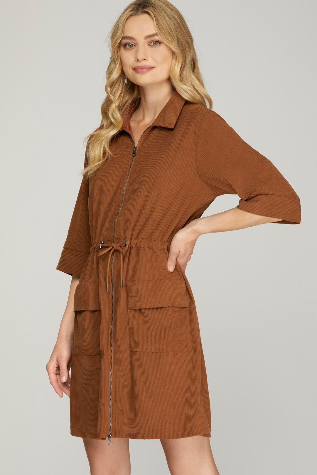 ZIP UP DRESS WITH POCKETS AND DRAW STRING WAIST