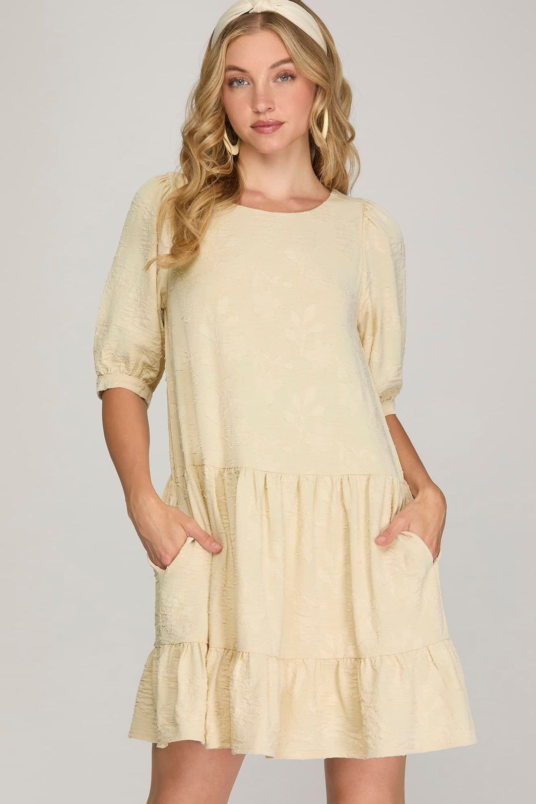 3/4 BUBBLE SLEEVE PLEATED WOVEN DRESS