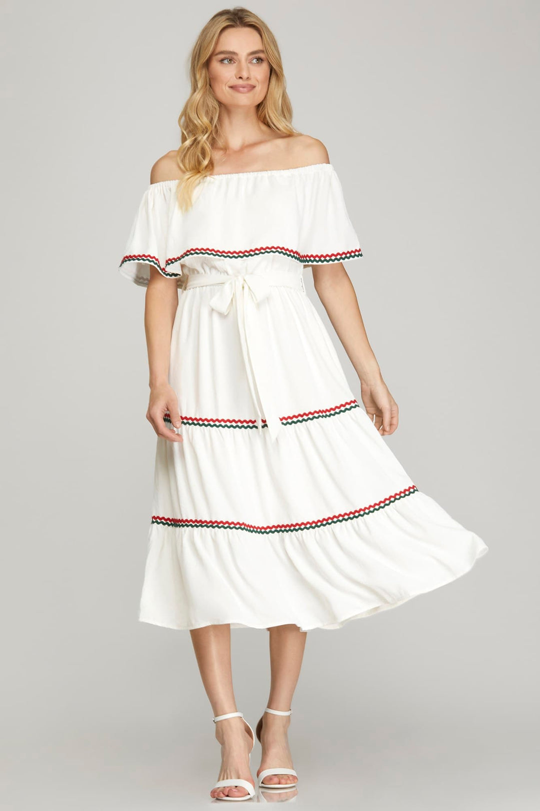 OFF SHOULDER TIERED WOVEN MIDI DRESS WITH CONTRAST RIC RAC TRIM