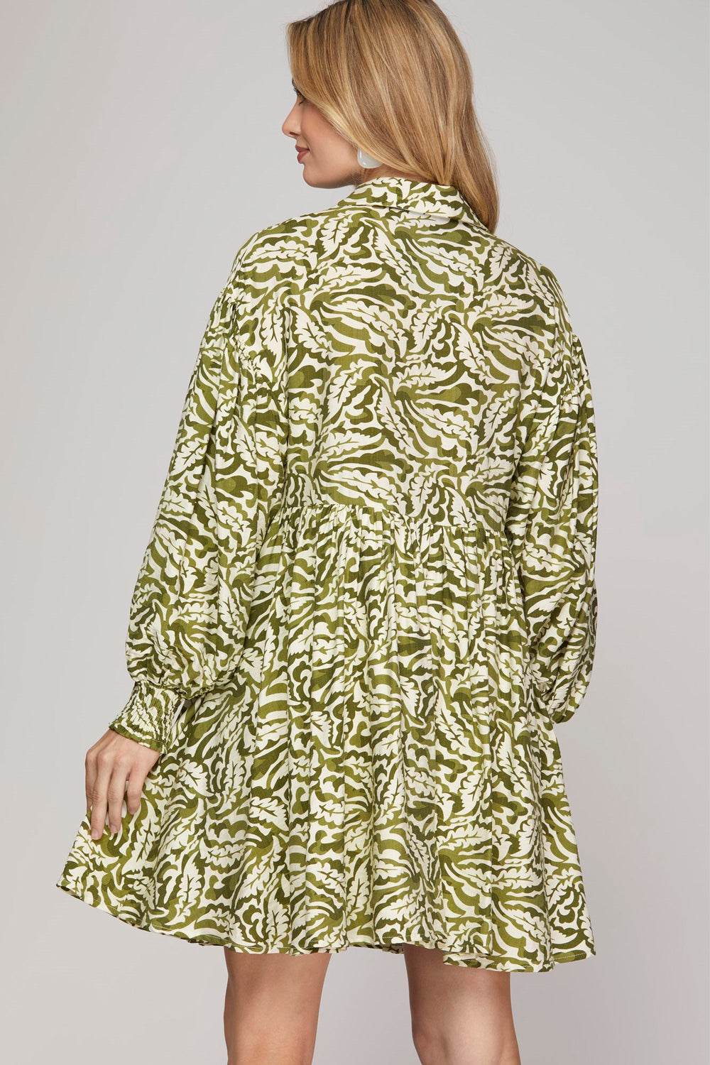 LONG SLEEVE BUTTON DOWN SIDE POCKET PRINTED DRESS