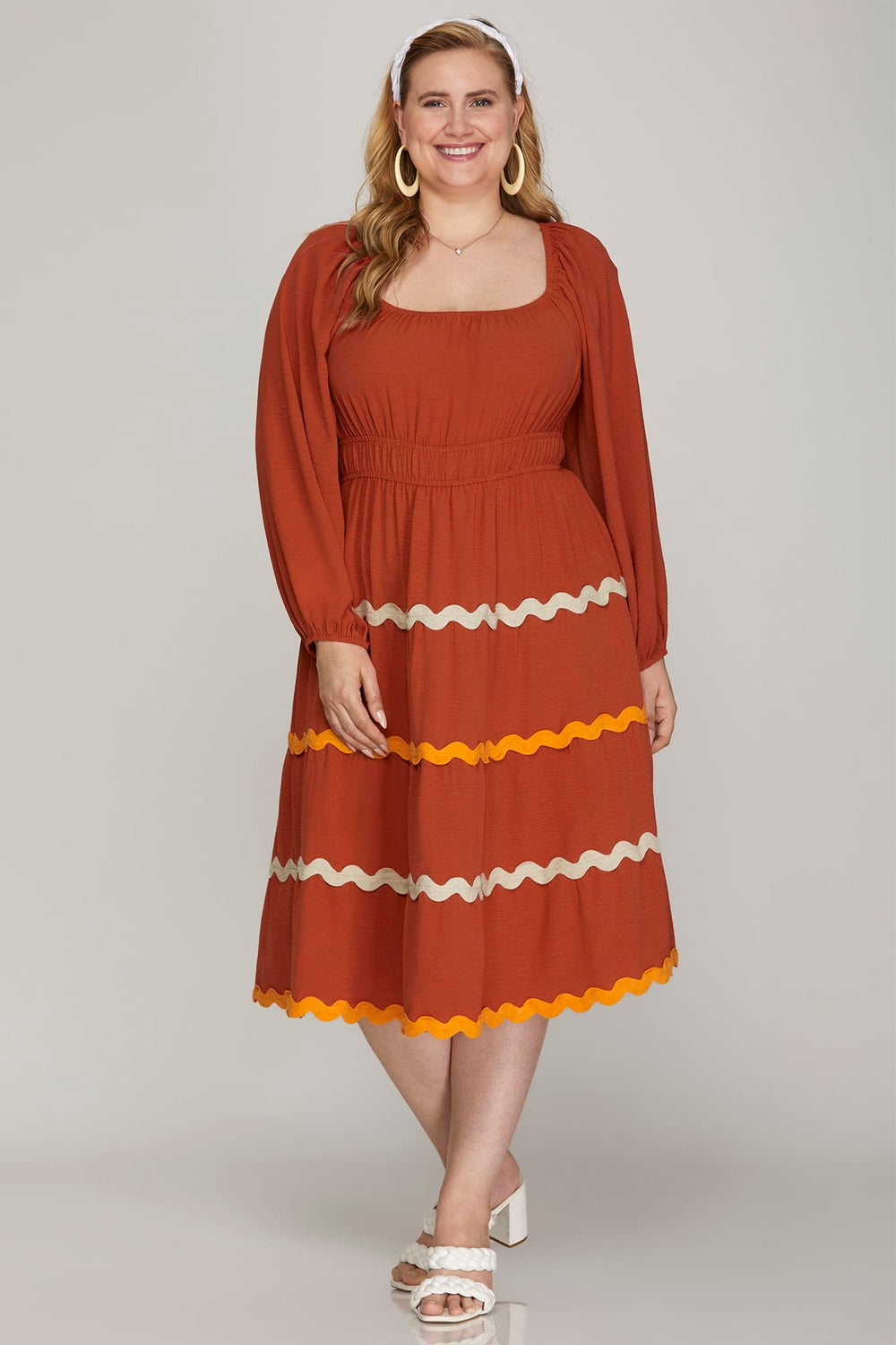 PLUS - LONG SLEEVE WOVEN TIERED RIC RAC TRIM DRESS