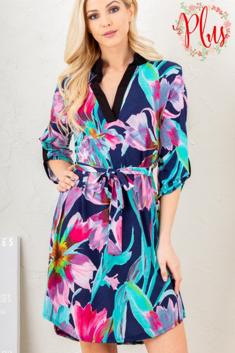 PLUS SIZE V NECK 3/4 SLEEVE MIDI DRESS-SHD1020