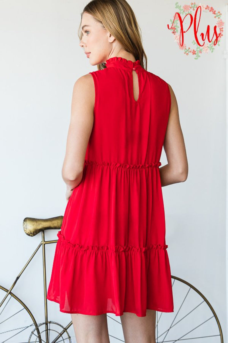 Elevate your wardrobe with this sleeveless mock neck mini dress, designed for a polished and modern look. The solid fabric provides versatility for any occasion, while the ruffled detail adds texture and visual interest. The keyhole button back creates an elegant focal point, offering both style and functionality. Perfect for plus-size figures, this dress combines comfort with contemporary design, making it an essential piece for your collection.