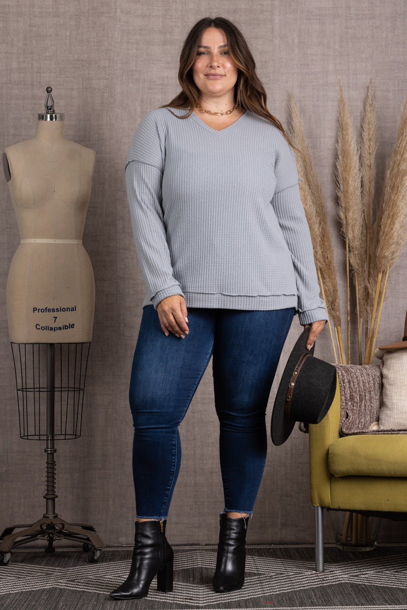 Stand out in style with this lovely ribbed knit top. The stylish silver hue of this plus-size top adds extra drama to its trendy silhouette, while the long sleeves provide extra comfort and warmth. A timeless addition to any wardrobe.