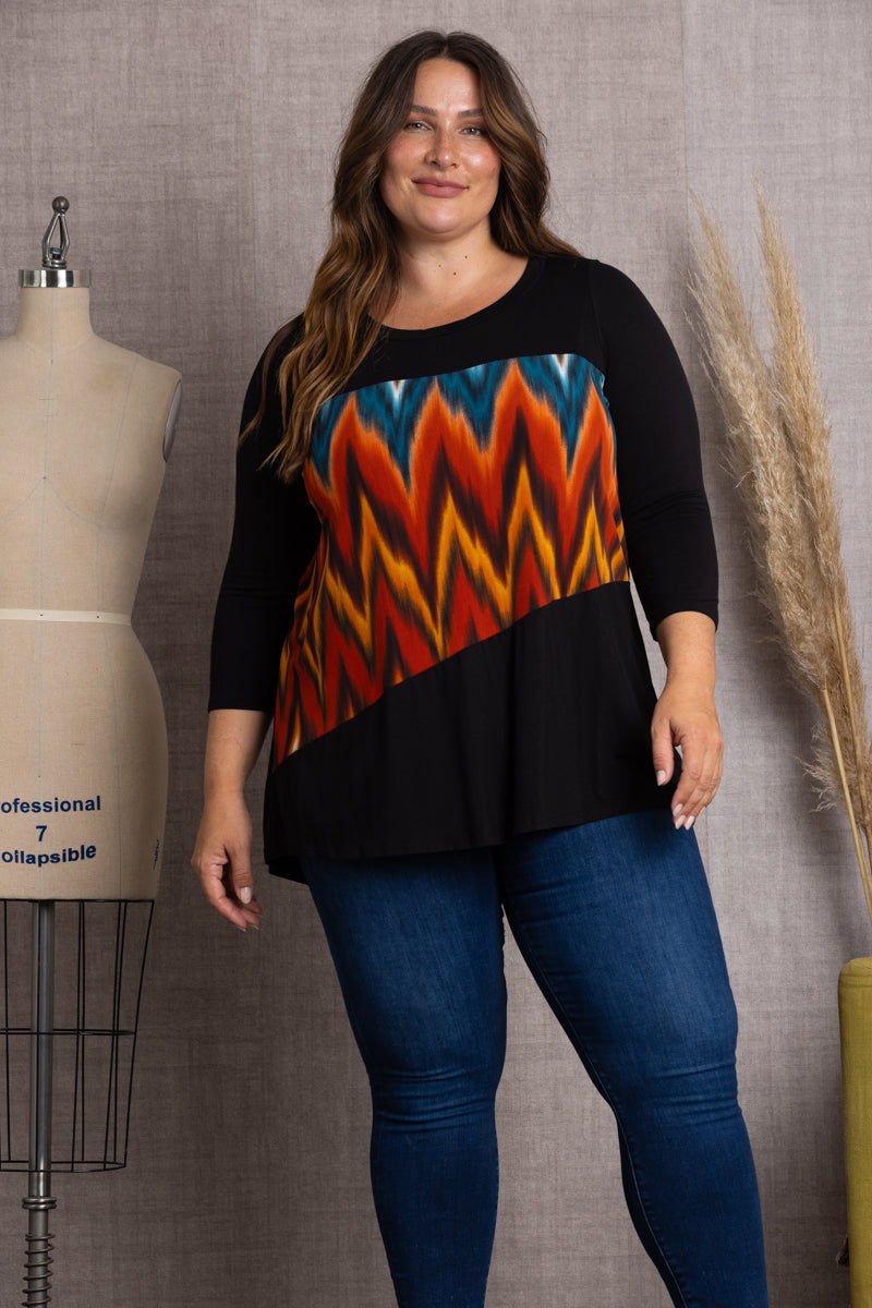 BLACK MULTI COLOR 3/4 SLEEVE PLUS SIZE TOP-4T2261-1