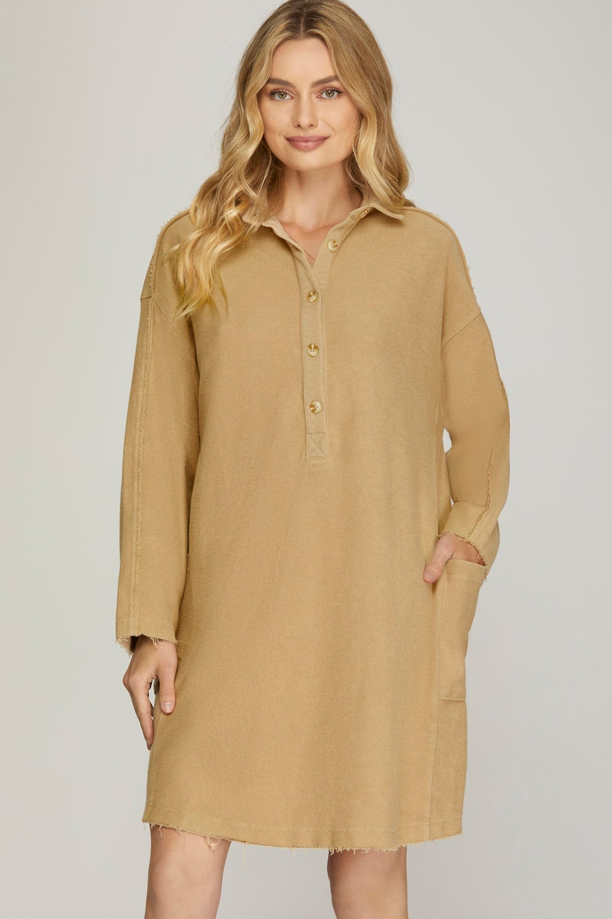 Effortlessly chic meets cozy comfort in this laid-back French terry dress. The collared neckline and half-button front add a polished touch, while the relaxed washed fabric keeps things casual and cool. Long sleeves provide versatile coverage, and practical pockets mean you've got somewhere to stash your essentials. Perfect for those days when you want to look put-together without trying too hard—dress it up with sneakers or elevate it with heels