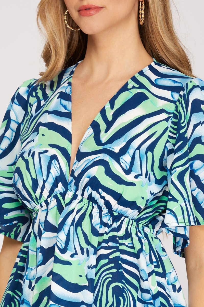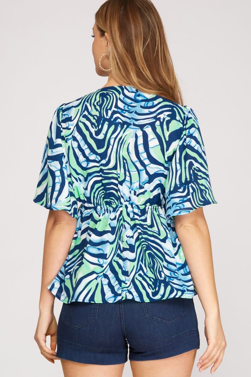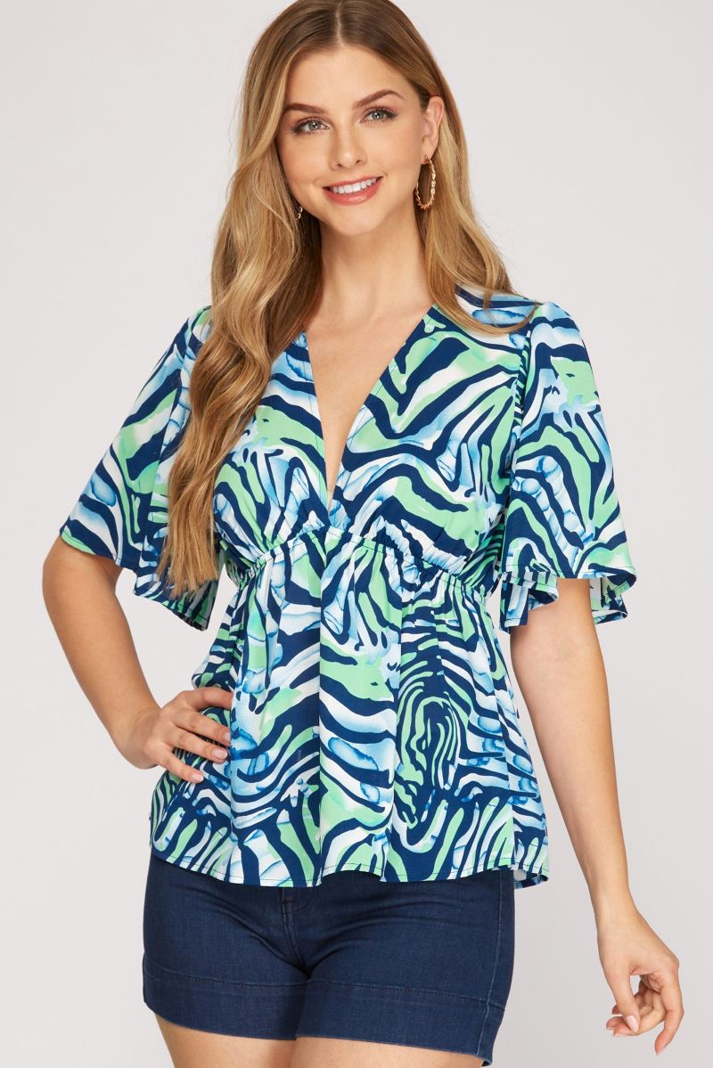 Bring a touch of whimsy to your outfit with this navy woven top, featuring fluttery short sleeves and a flirty plunge neckline. Its breezy fabric and charming design make it perfect for playful days and stylish evenings. Elevate your look with a splash of fun and effortless elegance!