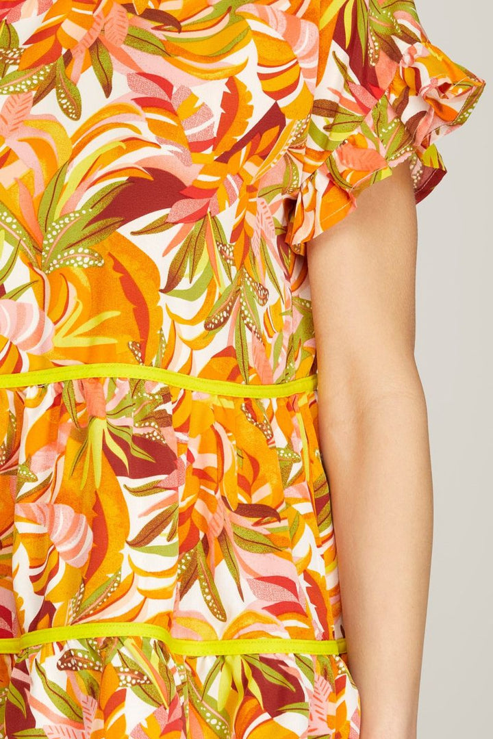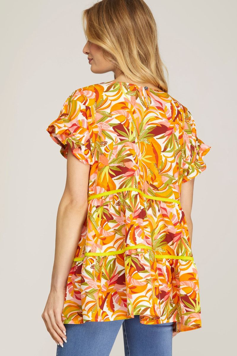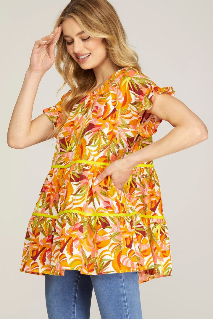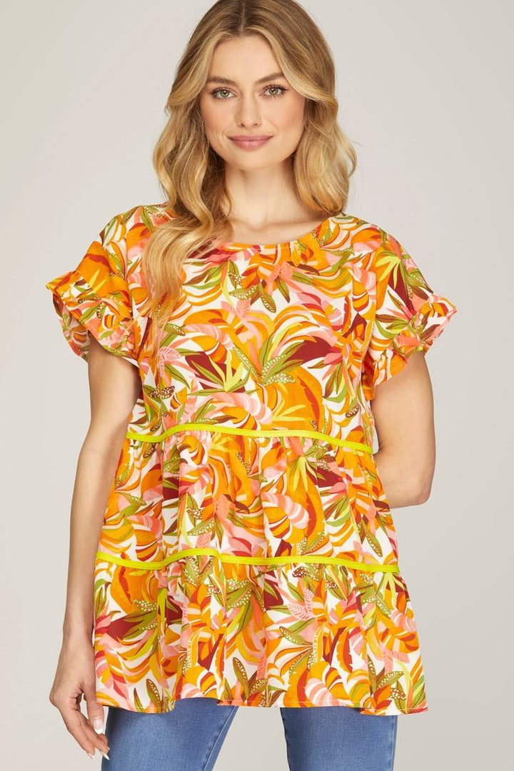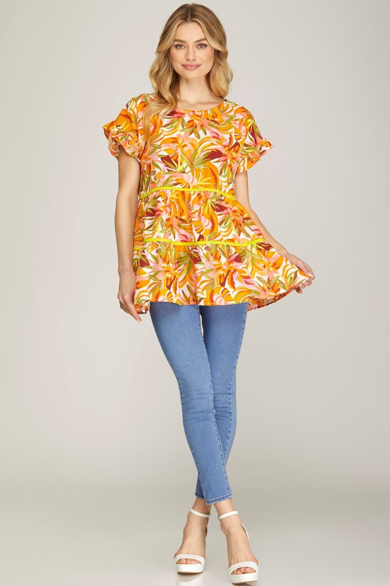 Brighten your wardrobe with this playful orange and yellow floral print woven top. Featuring a relaxed drop shoulder design, it offers effortless comfort and a breezy fit perfect for sunny days. The vibrant floral pattern adds a cheerful touch to any outfit, making it your go-to piece for casual fun and easy style.