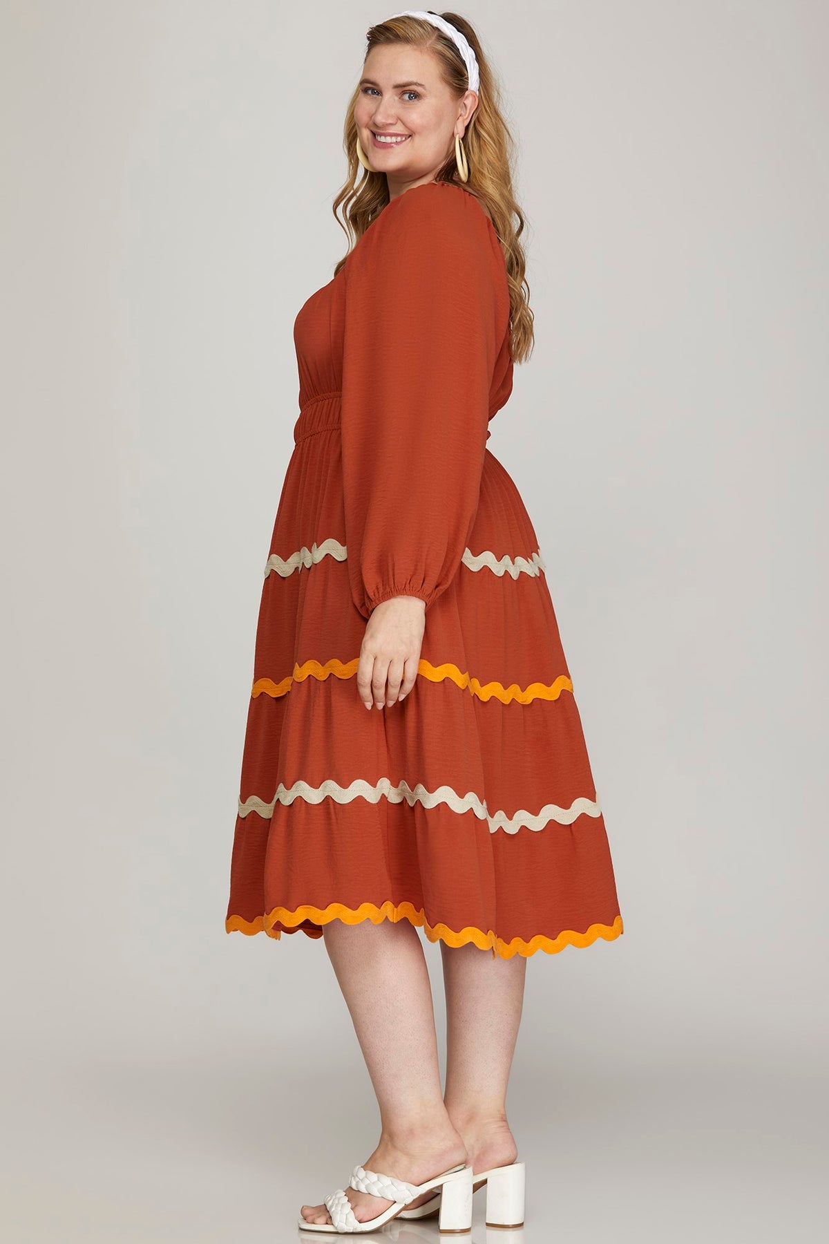 Elevate your wardrobe with this charming long sleeve woven dress, designed for a flattering fit. The tiered silhouette creates beautiful dimension and movement, while delicate ric rac trim adds a playful, vintage-inspired detail. Perfect for casual outings or dressed-up occasions, this piece combines comfort with effortless style. Available in plus sizes to celebrate every body type