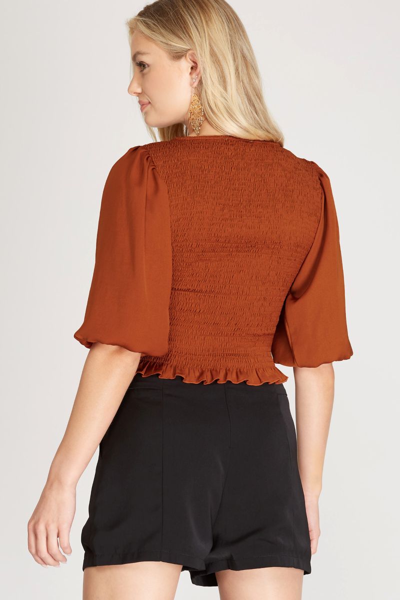 LONG SLEEVE V NECK SOLID TOP WITH SHIRRING DETAIL