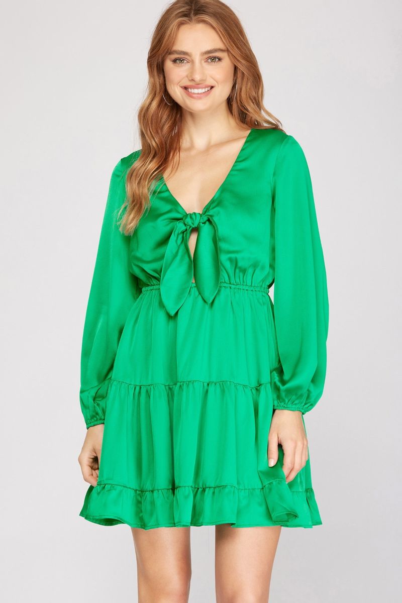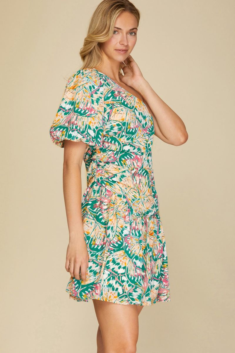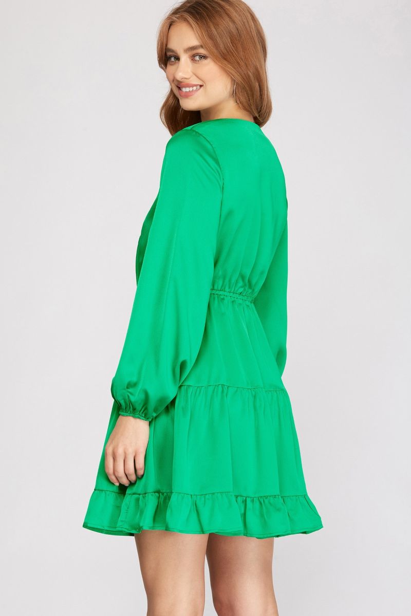 3/4 BUBBLE SLEEVE PLEATED WOVEN DRESS