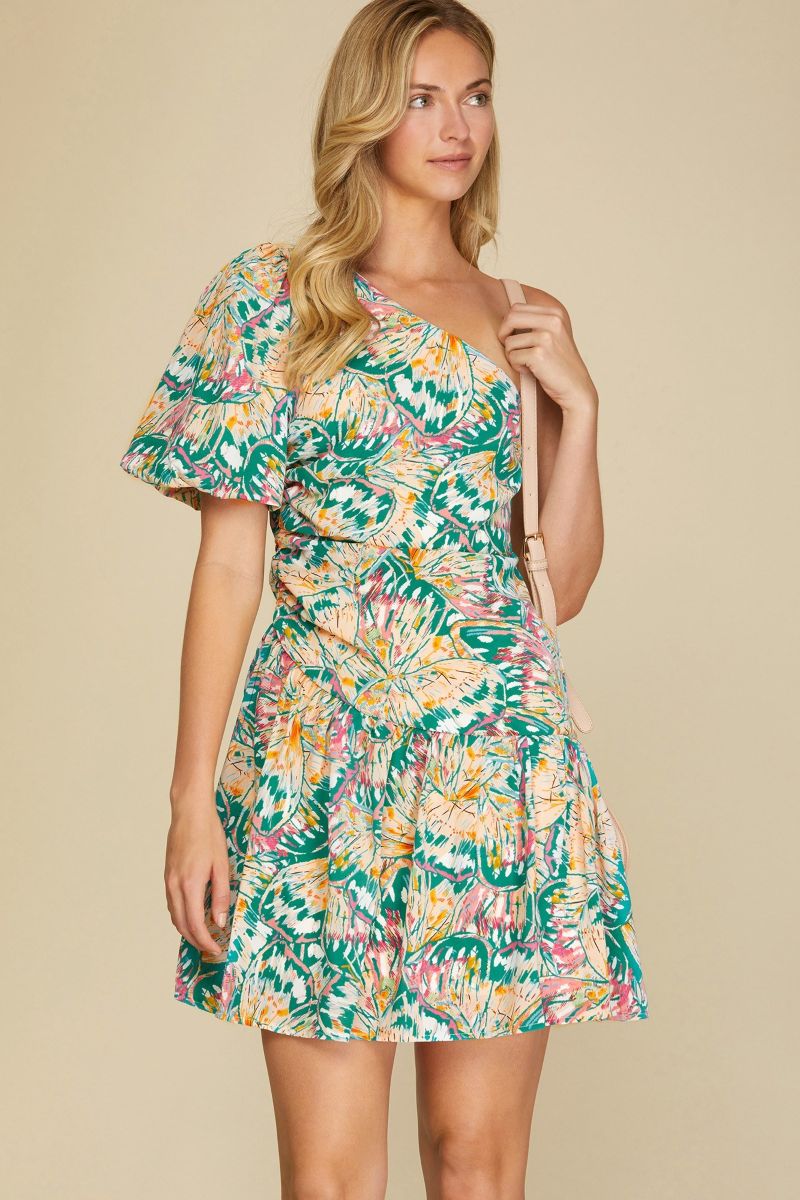 BUBBLE SLEEVE PRINT WOVEN TIERED MIDI DRESS