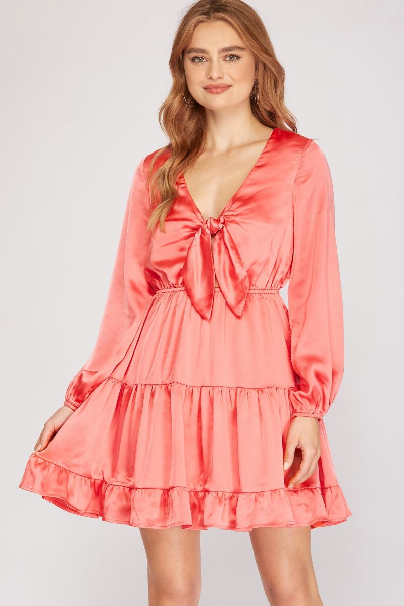 LONG SLEEVE WOVEN DRESS WITH CONTRAST BINDING DETAIL WITH SIDE POCKETS