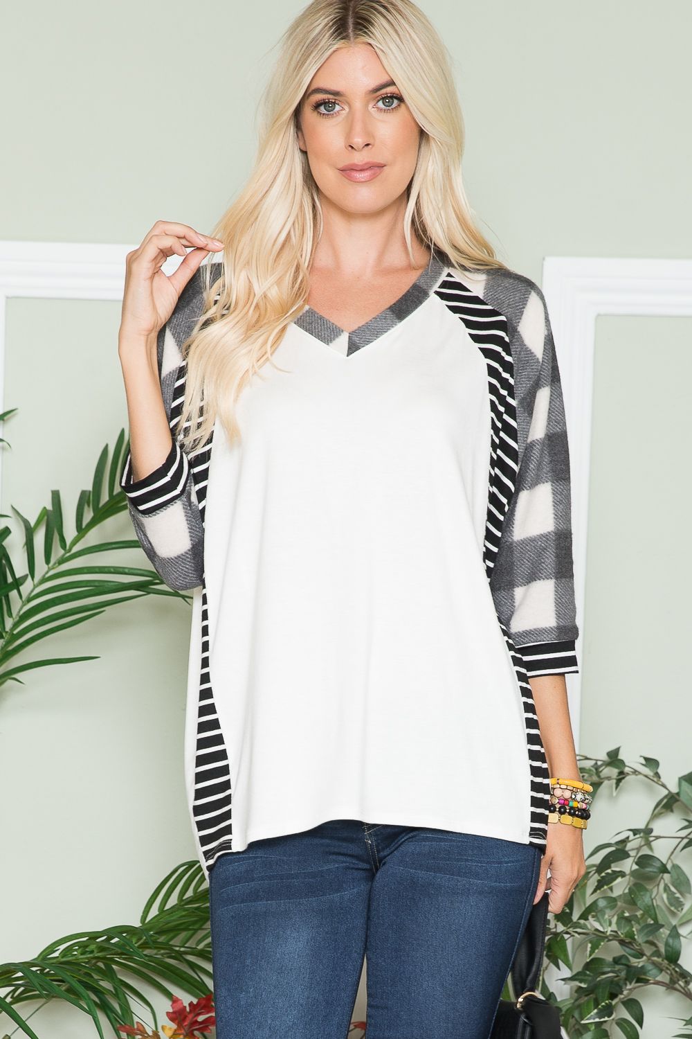 The Plaid and Stripe Contrast Detail V-Neck Top features a stylish blend of plaid and striped patterns, creating a chic and modern look. Its flattering V-neck design and comfortable fit make it perfect for both casual outings and dressier occasions.