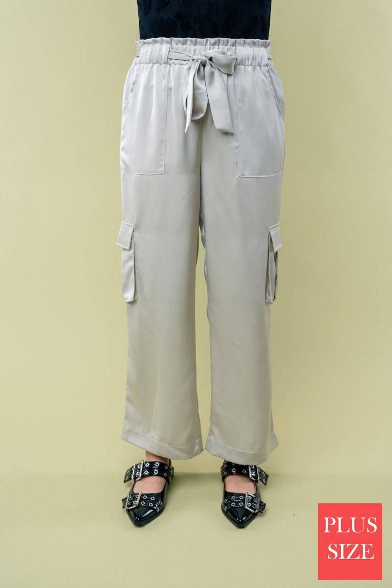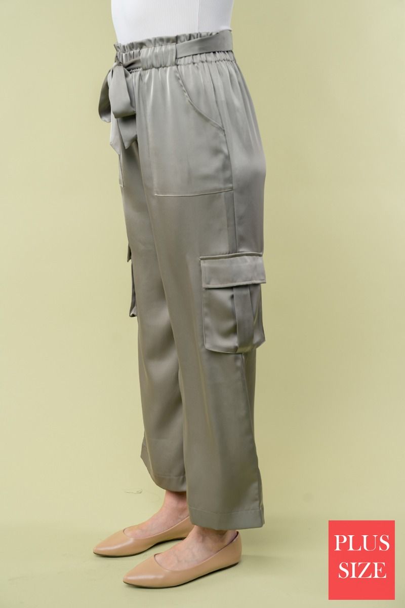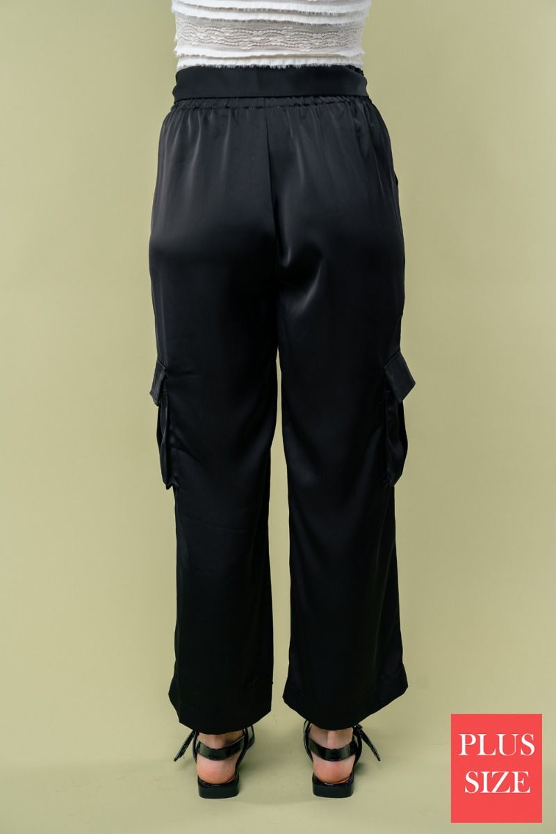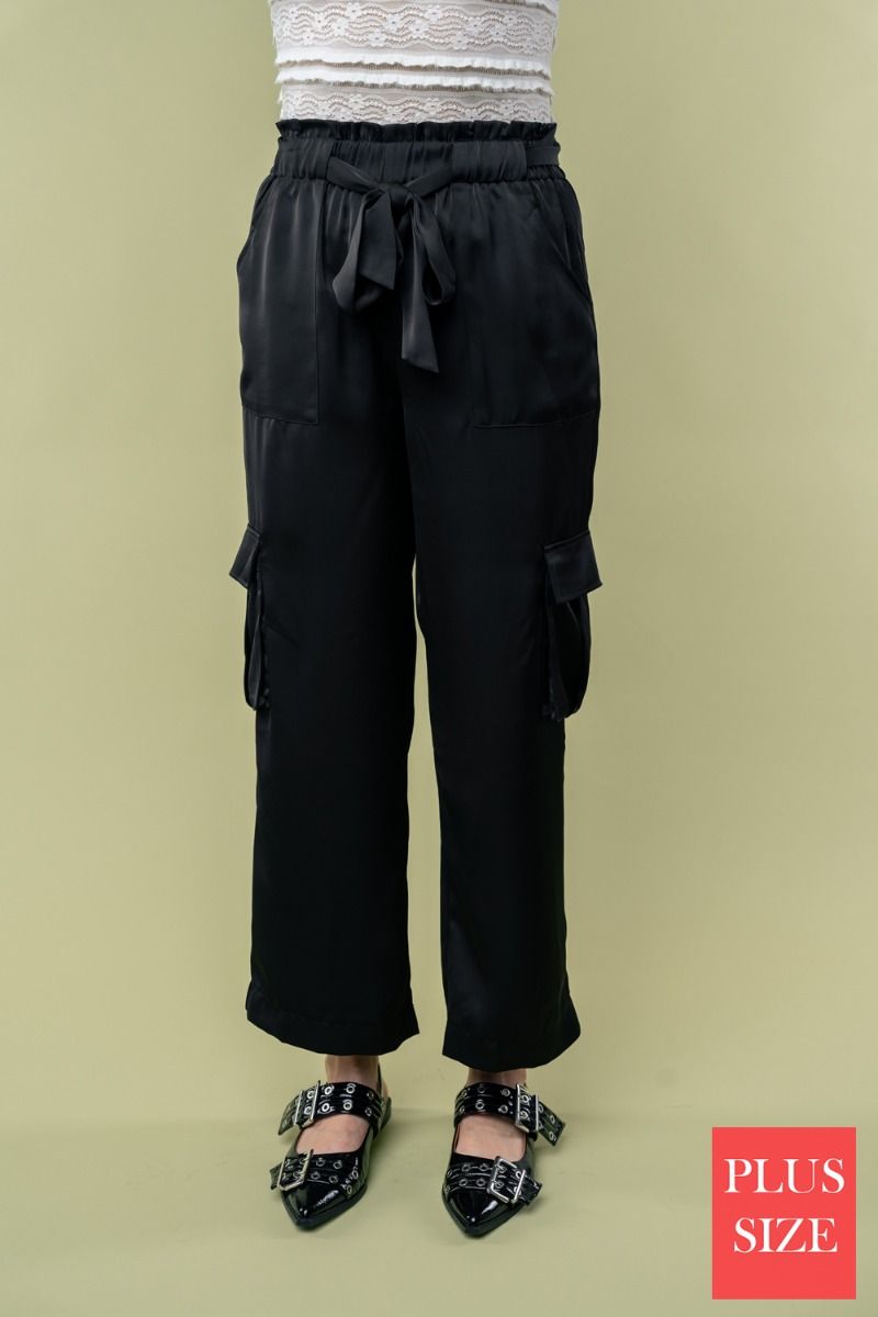 These high-waisted cargo pants are your new go-to for effortless style! Crafted from lightweight woven satin, they deliver a smooth, sophisticated drape that feels as good as it looks. The elastic waist with adjustable front tie gives you a customizable fit that moves with you, while the true-to-size cut ensures a flattering silhouette. Perfect for dressing up or down, these versatile pants bring that perfect blend of comfort and chic to any wardrobe.