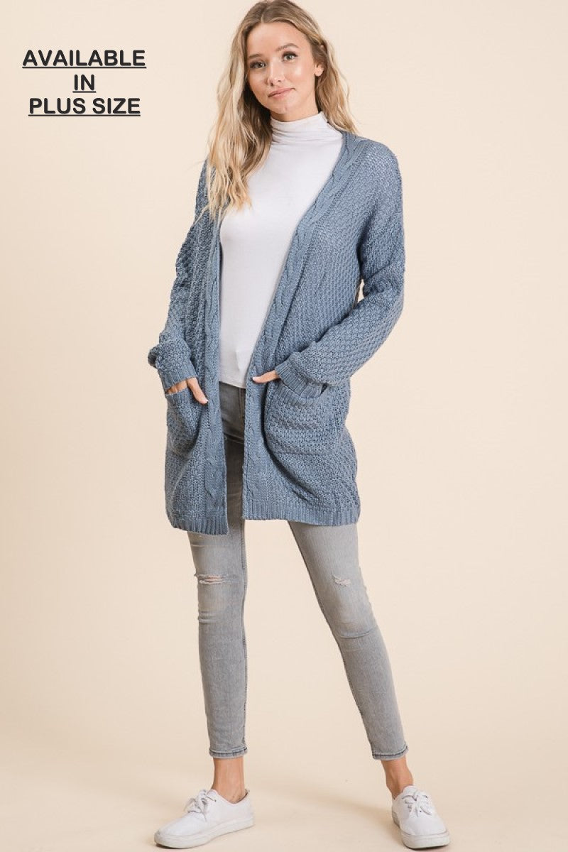 This plus-size cardigan in a blue-grey waffle knit is perfect for snuggling up (without sacrificing style!). The open-front design adds a little extra flair while keeping you cozy. Stay chic and comfortable all day long with this charming cardigan.