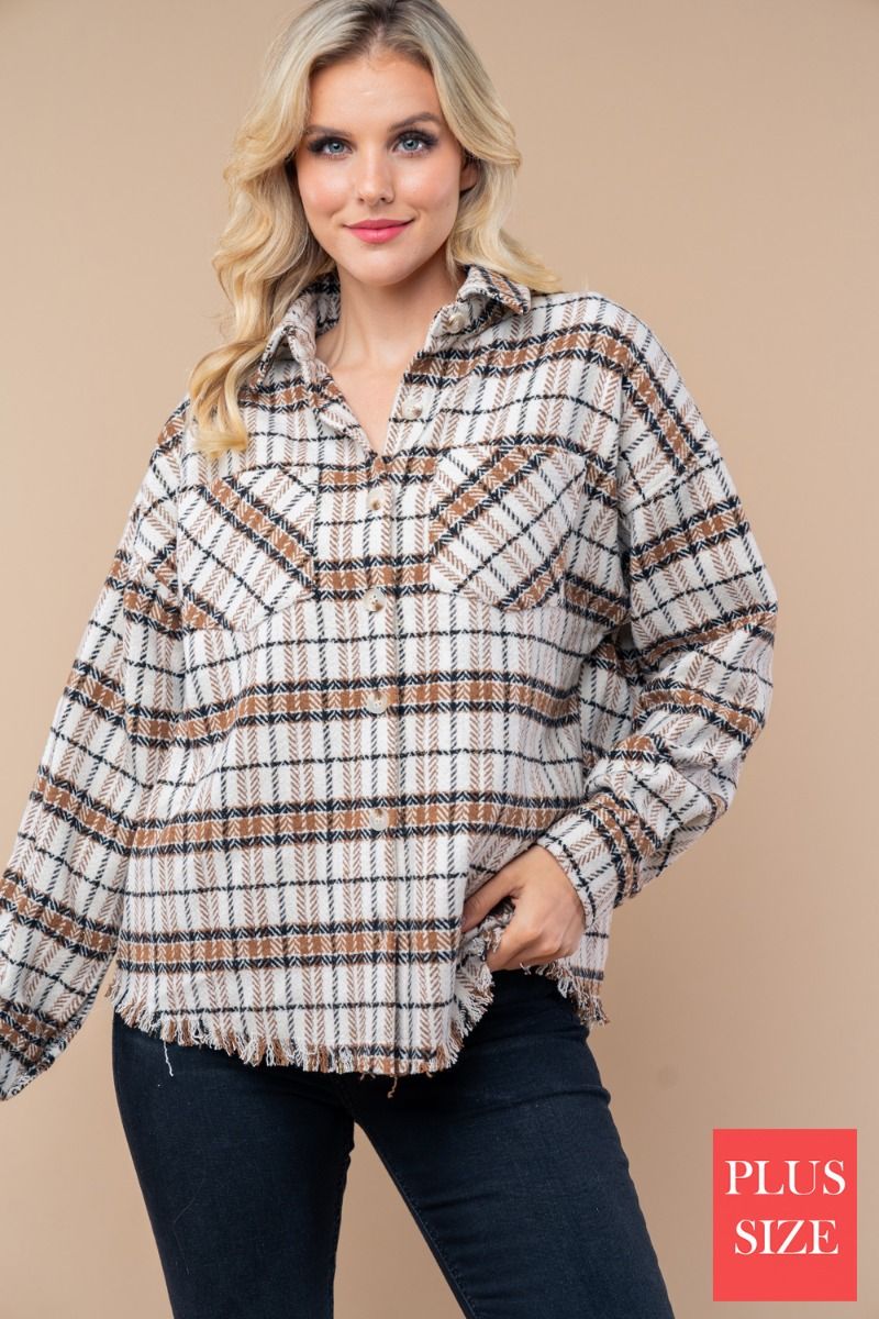 Layer up with our Button Down Plus Size Plaid Woven Shacket—the perfect piece that's part shirt, part jacket, all style! This lightweight woven wonder features a classic plaid pattern that pairs with everything in your closet. Button down the front for easy styling, slip your hands into the practical patch pockets, and rock that effortlessly cool vibe with the frayed hem detail. Whether you're dressing it up over a tee or throwing it on as a standalone statement, this shacket is your new go-to for casual comfort that doesn't compromise on fashion.