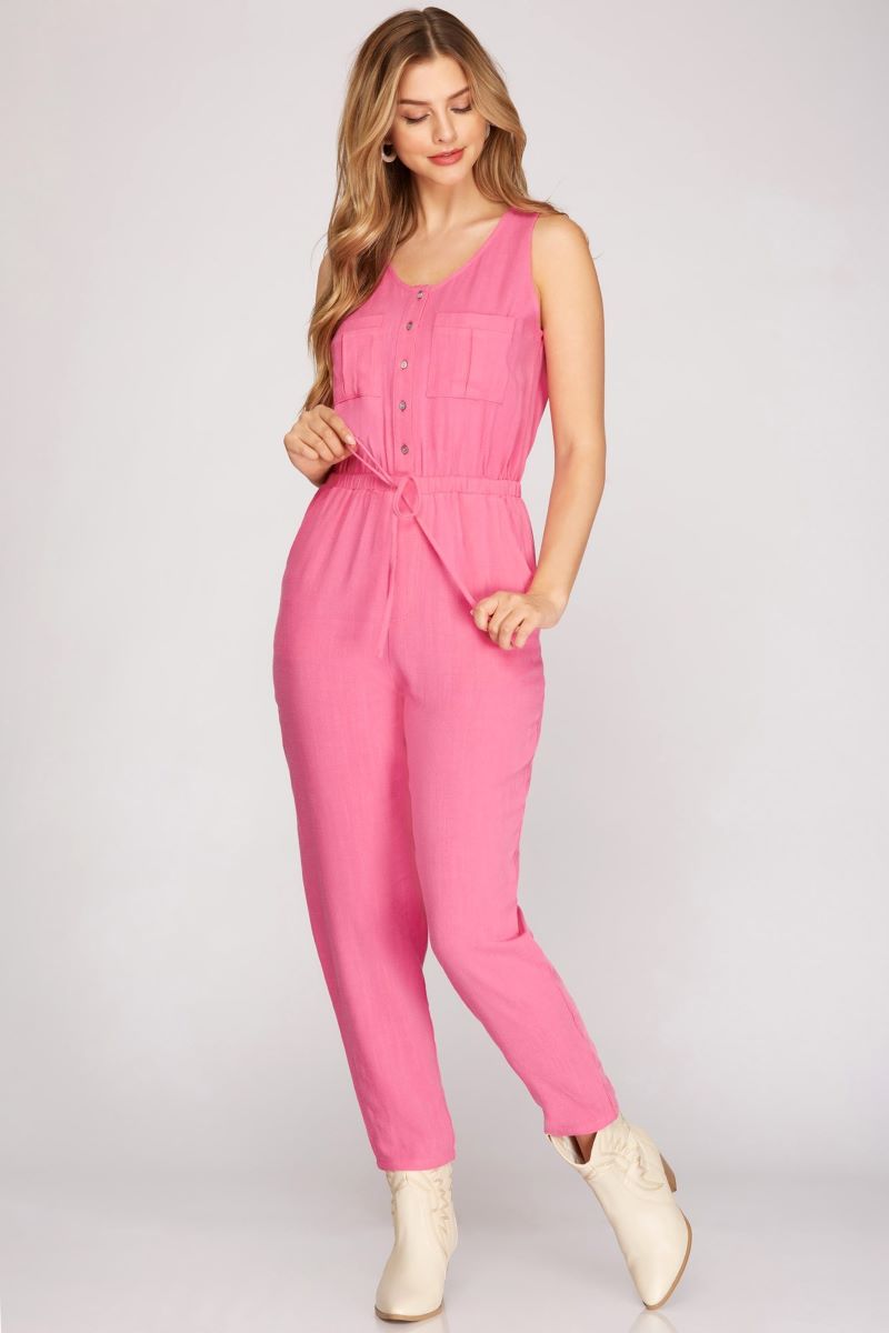 Get ready to strut your stuff in this playful Pink Sleeveless Button Down Elastic Waist Woven Jumpsuit! Perfect for any occasion, this jumpsuit features a unique design with a stylish button down front and elastic waist for a comfortable and flattering fit. Show off your fun side with this quirky and chic jumpsuit (and don't forget the pockets!).