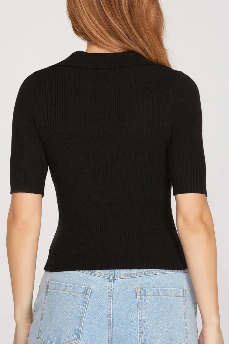 BLACK SHORT SLEEVES COLLARED KNIT CROP TOP
