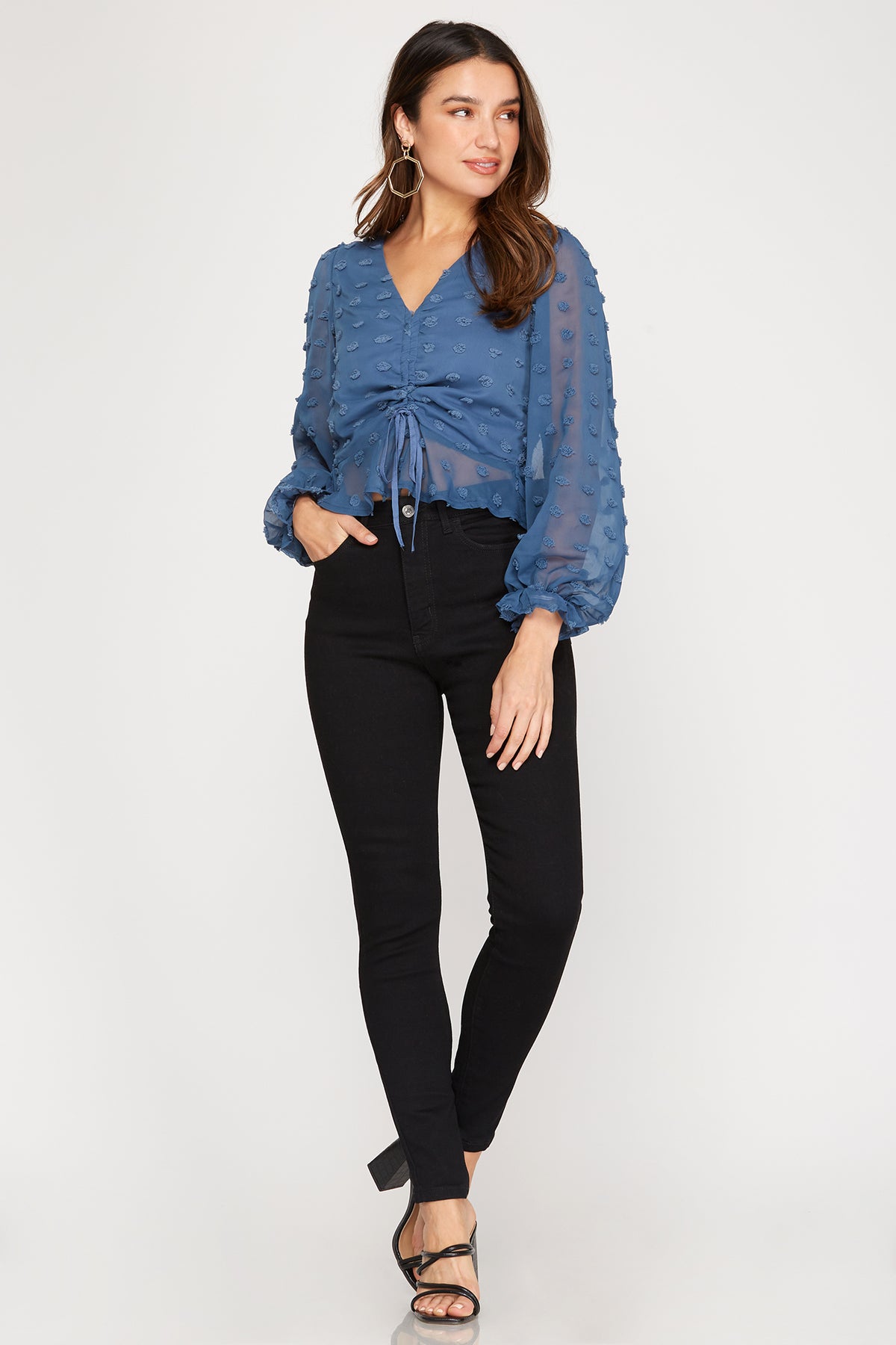 Bring a fresh twist to your look with this Swiss Dots woven top! Featuring long sleeves and a playful drawstring front, it’s perfect for adding a little fun to your everyday style. The subtle Swiss dot texture adds charm, making this top a lively choice for any occasion.