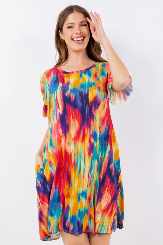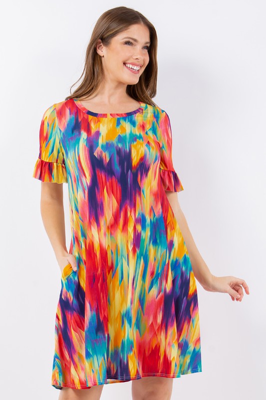 RUFFLED SLEEVE WOVEN FLORAL PRINT PINTUCK DRESS WITH SIDE POCKETS