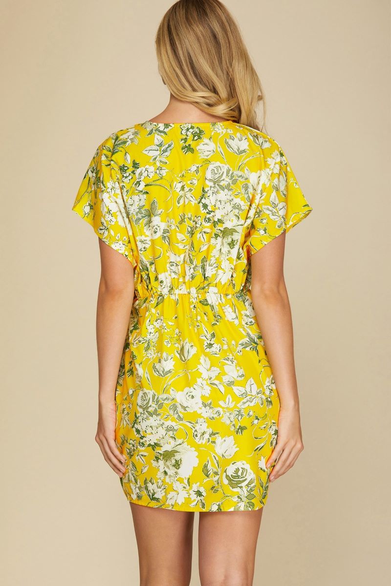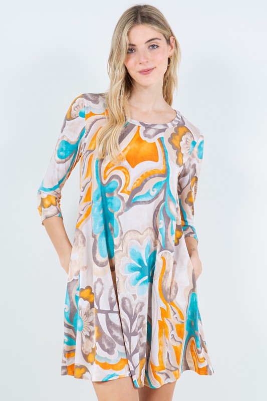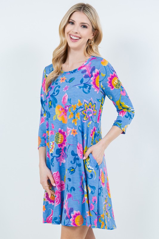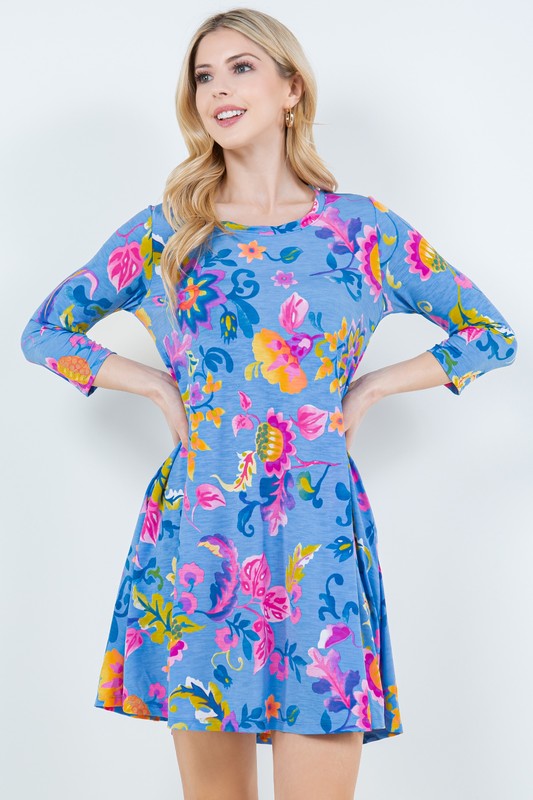 3/4 DOLMAN SLEEVE SATIN FLORAL PRINT DRESS WITH WAIST SASH