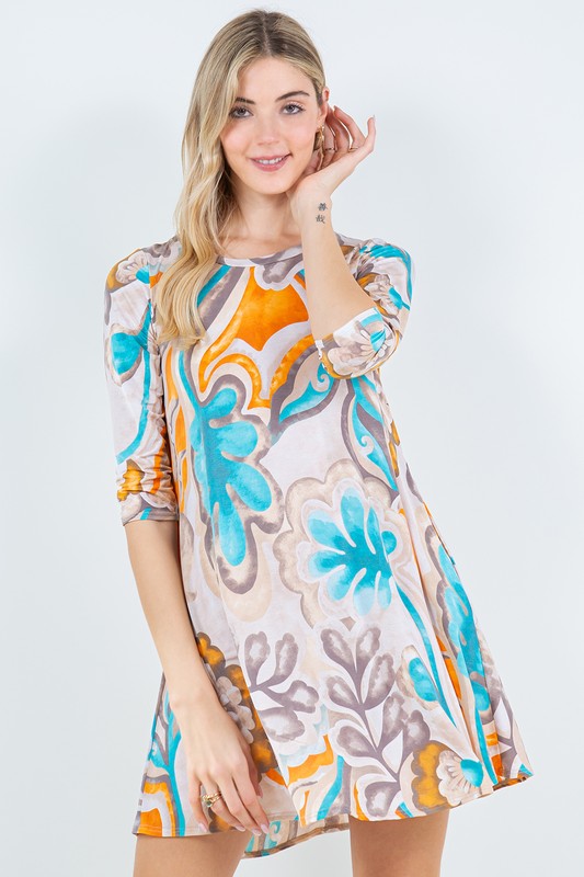 3/4 BUBBLE SLEEVE PLEATED WOVEN DRESS