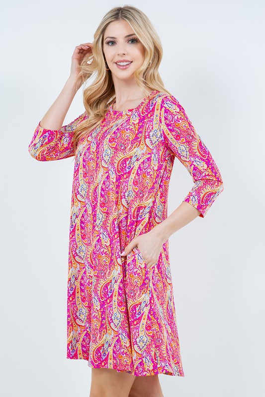 3/4 SLEEVE WOVEN PLAID TIERED DRESS WITH SIDE POCKETS