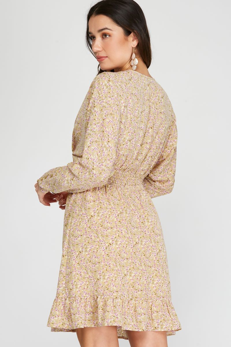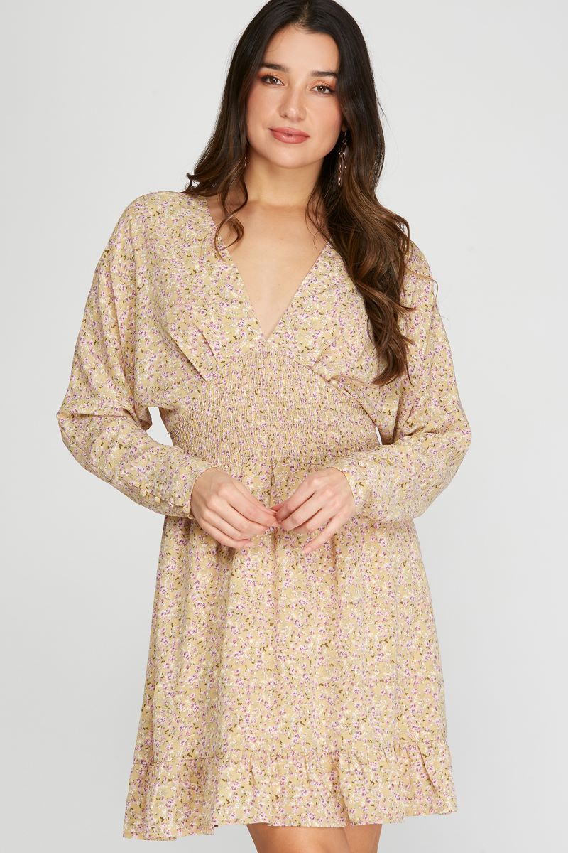 LONG SLEEVE WOVEN FLORAL PATTERN SURPLICE TIERED DRESS