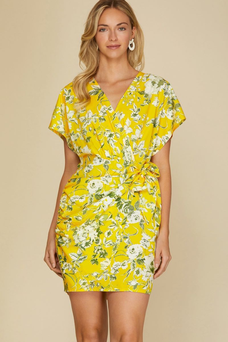 PUFF SLEEVE WOVEN PRINT SURPLICE BUBBLE HEM DRESS