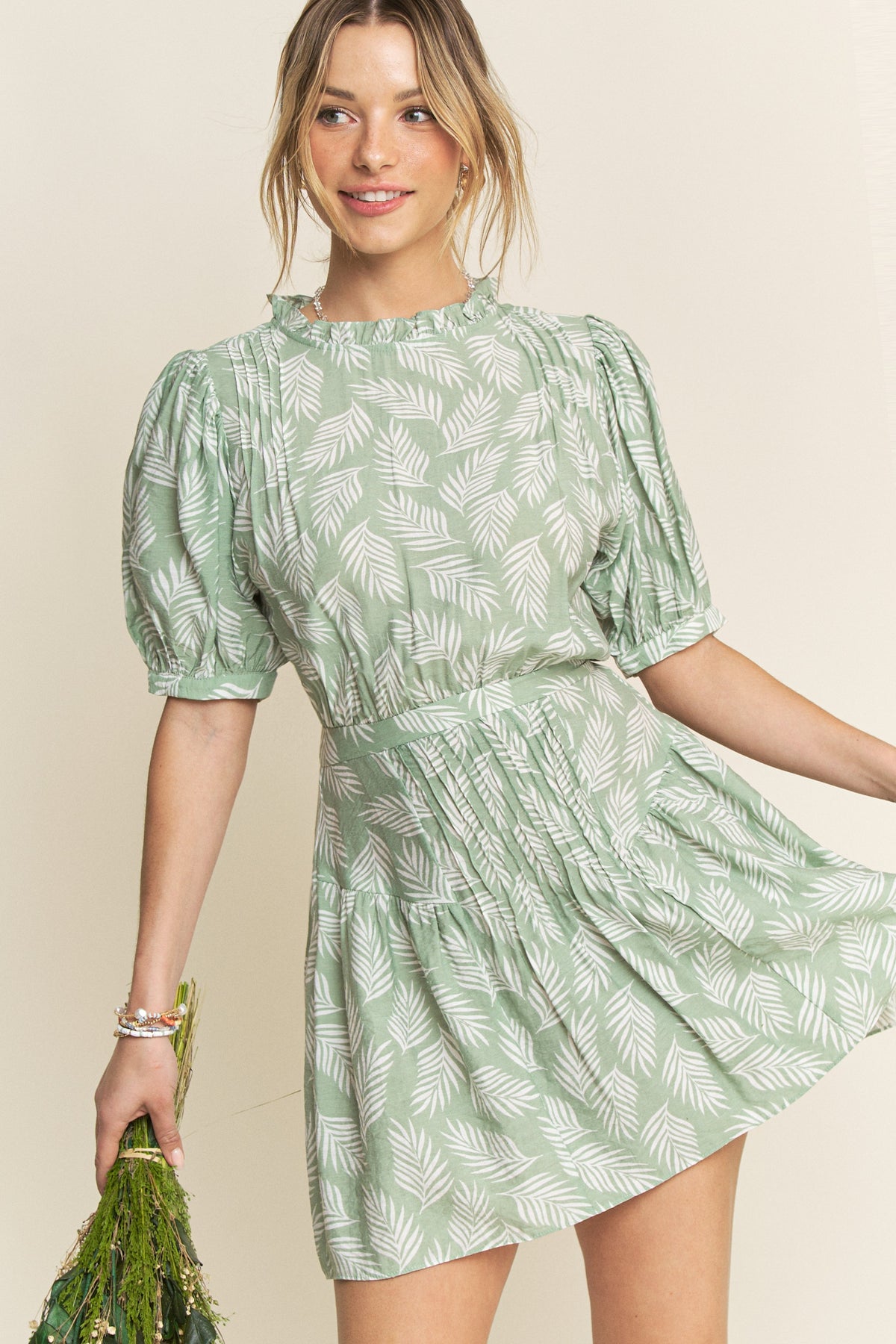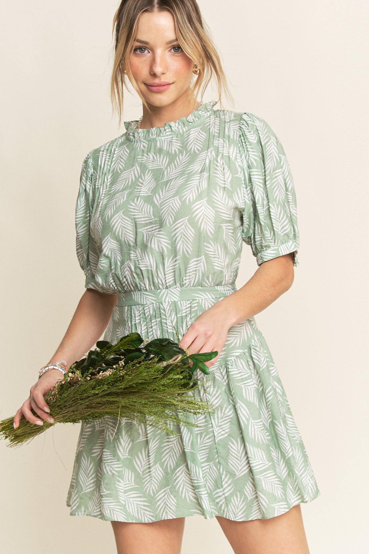 SAGE TROPICAL PRINT RUFFLED NECK PLEATED SKIRT MINI DRESS HYHD0026A