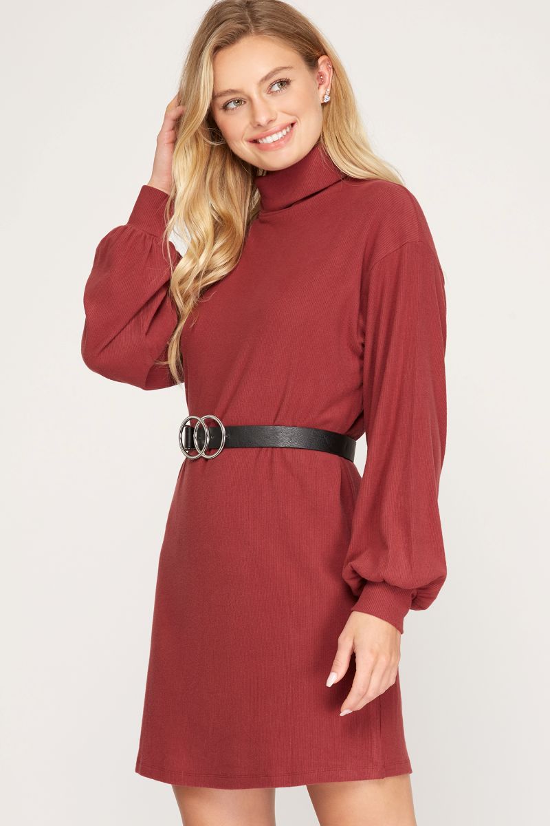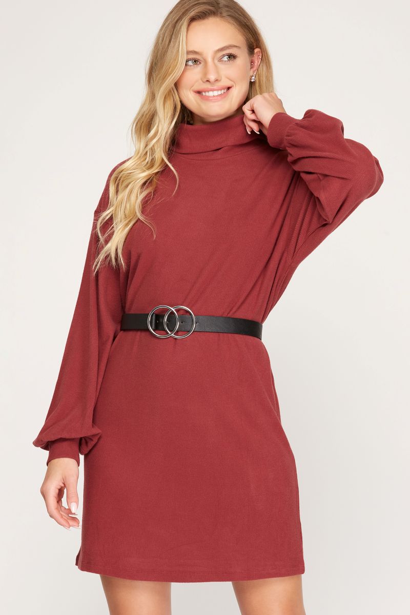 RED BEAN BRUSHED KNIT TURTLENECK MINI DRESS SKSS7643