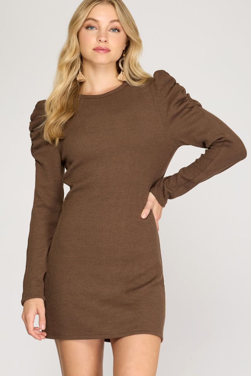 MOCHA LONG SHIRRED SLEEVES HEAVY KNIT MINI DRESS