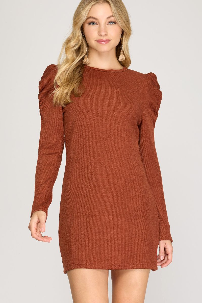RUST LONG SHIRRED SLEEVES HEAVY KNIT MINI DRESS