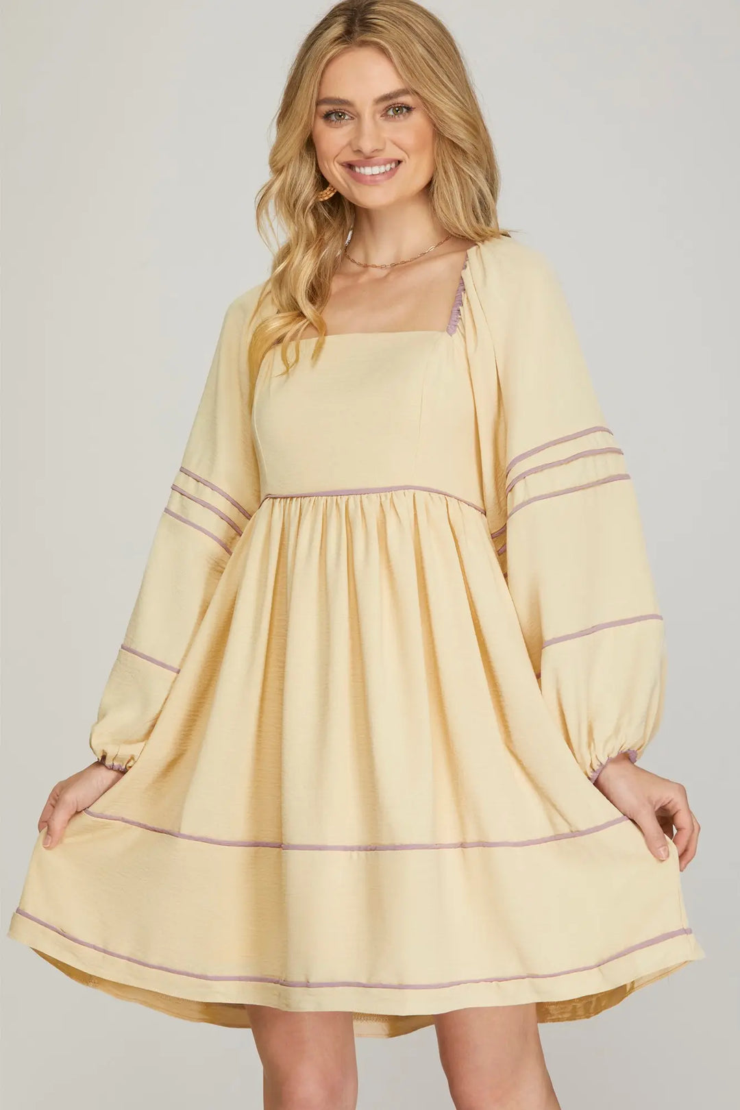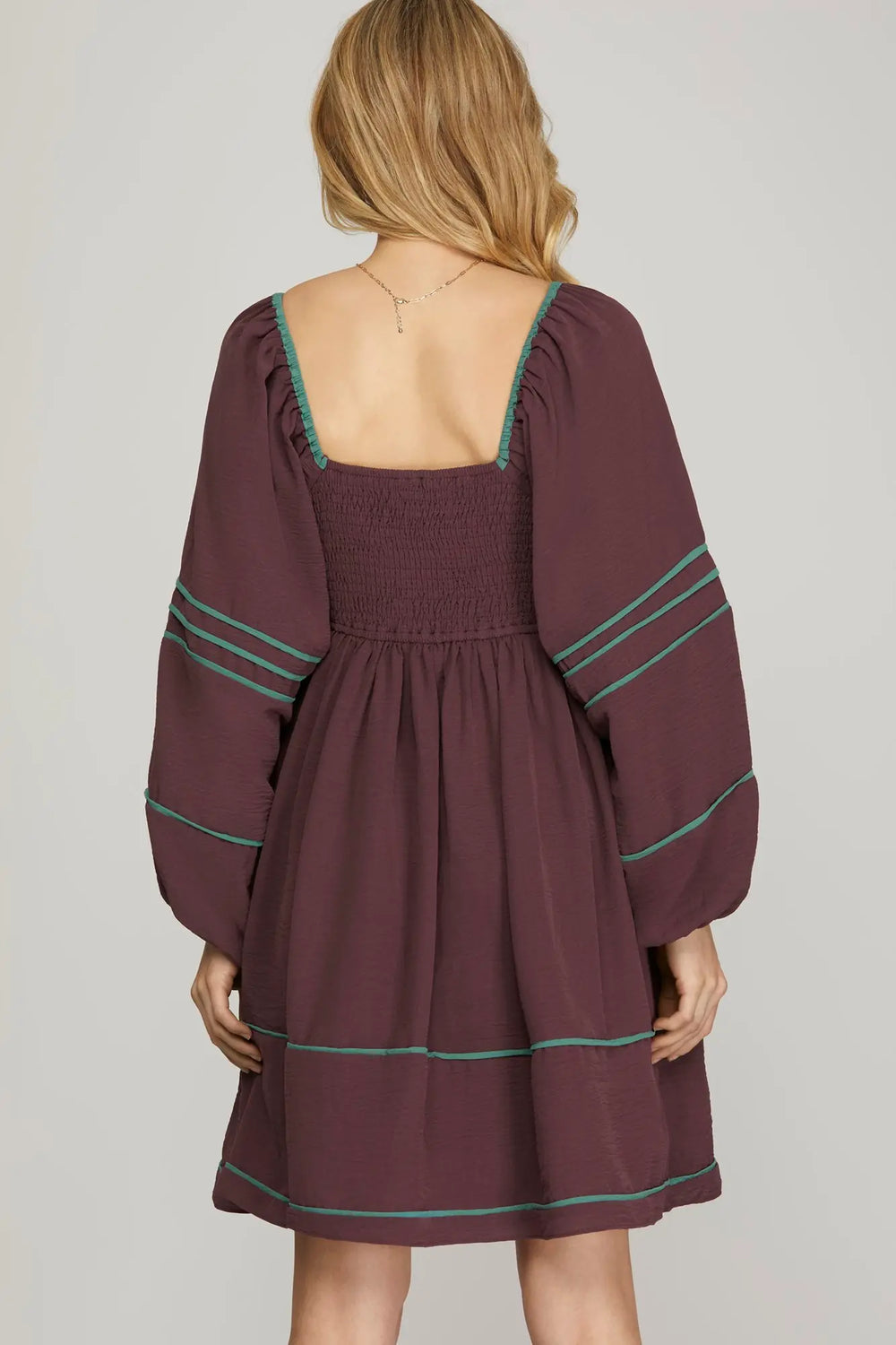 LONG SLEEVE WOVEN DRESS WITH CONTRAST BINDING DETAIL WITH SIDE POCKETS