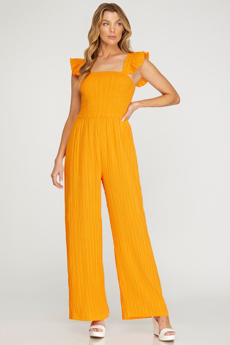 TANGERINE RUFFLE SLEEVES SMOCKED WOVEN JUMPSUIT SKSY6494