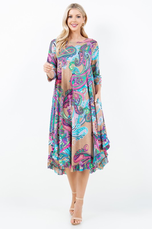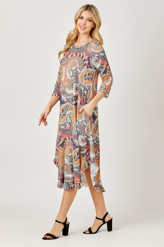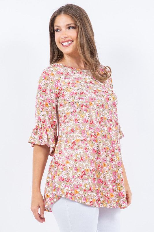 PINK 3/4 SLEEVES ASYMMETRIC RUFFLE HEM TUNIC TOP