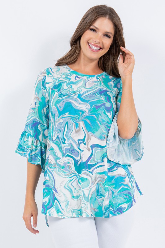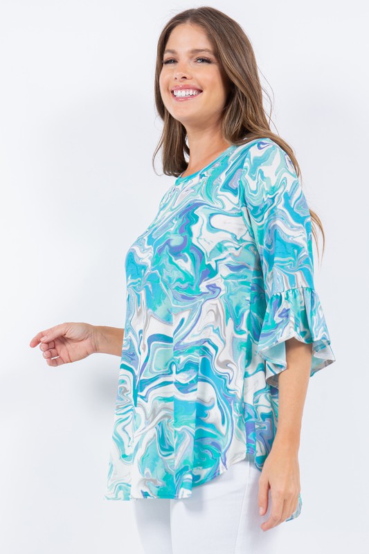 BLUE FLORAL V-NECK WITH TIE-DYE MARBLE CONTRAST TOP