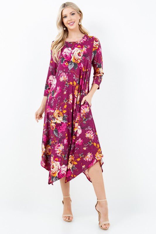 BURGUNDY 3/4 SLEEVES ASYMMETRICL CONTRAST TUNIC TOP