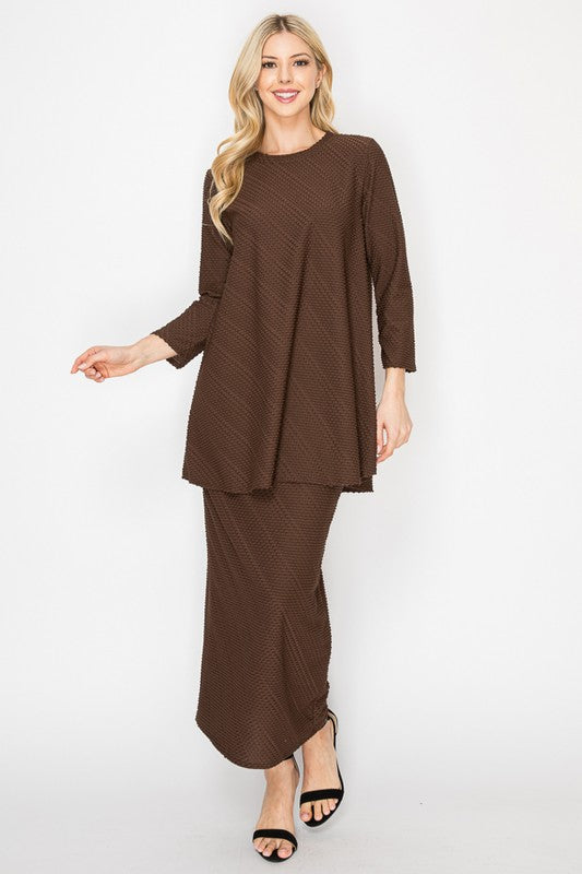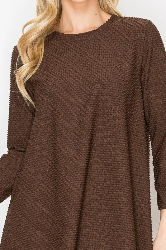 BROWN 3/4 SLEEVES ASYMMETRICL CONTRAST TUNIC TOP