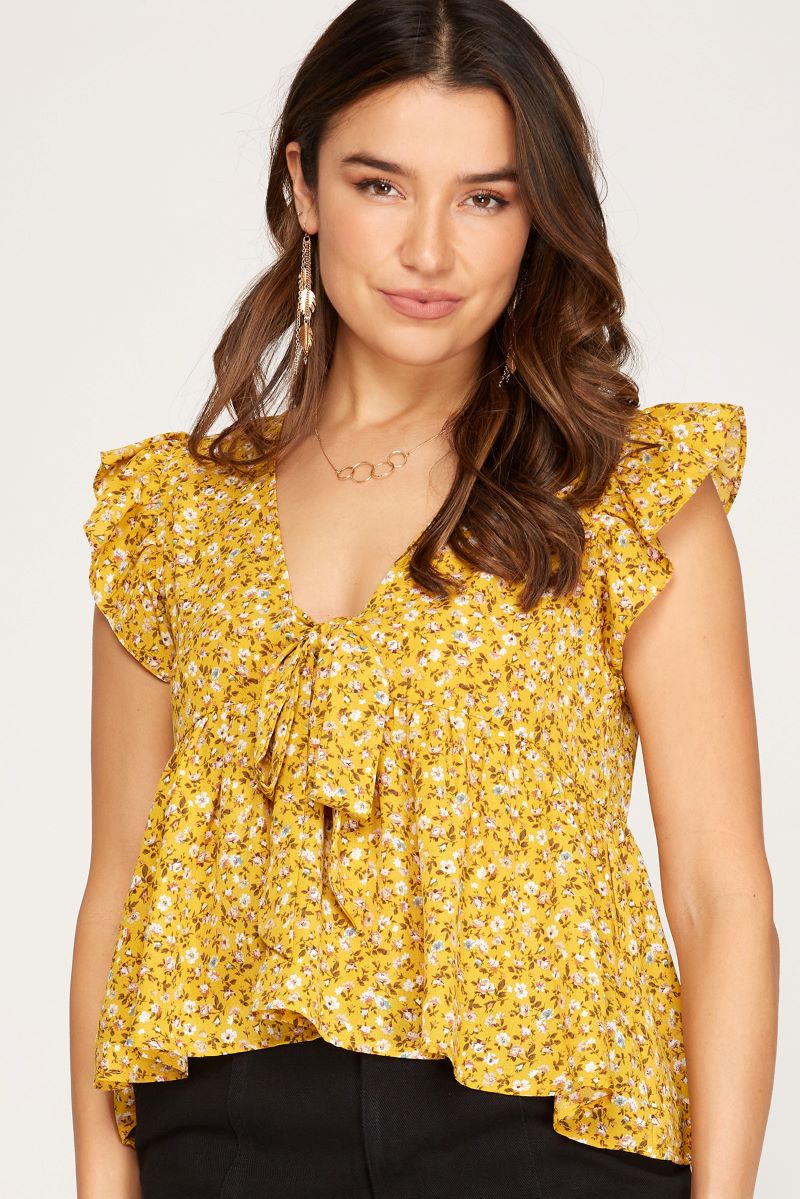 BLACK FLORAL FLUTTER SLEEVES CENTER SLIT WOVEN MIDI DRESS SKSY6967