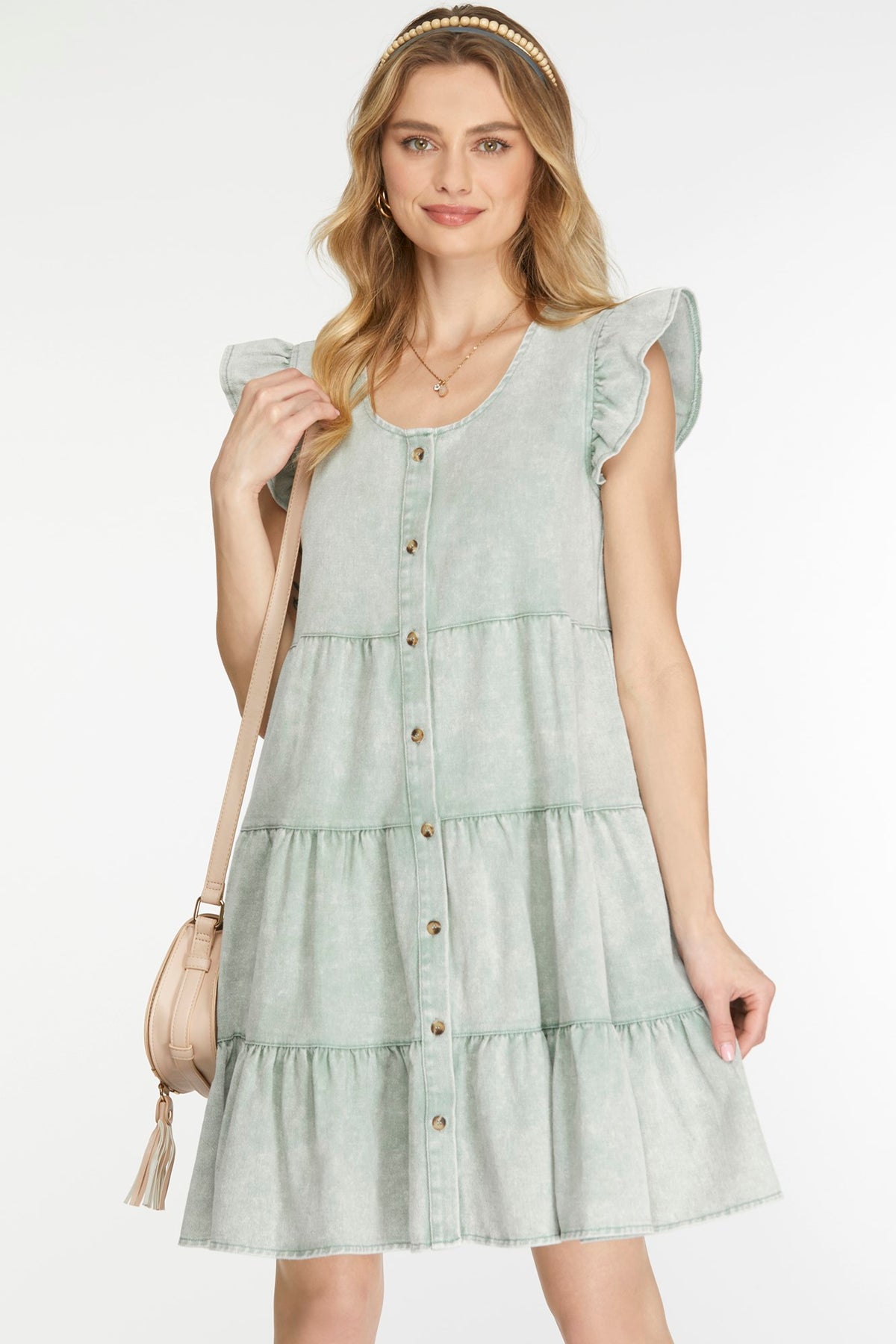 Elevate your everyday style with this charming ruffle sleeve tiered button-down dress! Crafted from soft wash twill, it features delicate ruffled sleeves and a flattering tiered silhouette that adds movement and dimension. The classic button-down front makes it effortlessly versatile—dress it up with heels for a night out or keep it casual with sneakers for weekend adventures. Perfect for anyone who loves a touch of feminine flair with practical, comfortable wear.