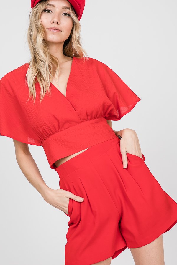 PEACH BLUSH WRAP W/ TIE LINEN SHORTS