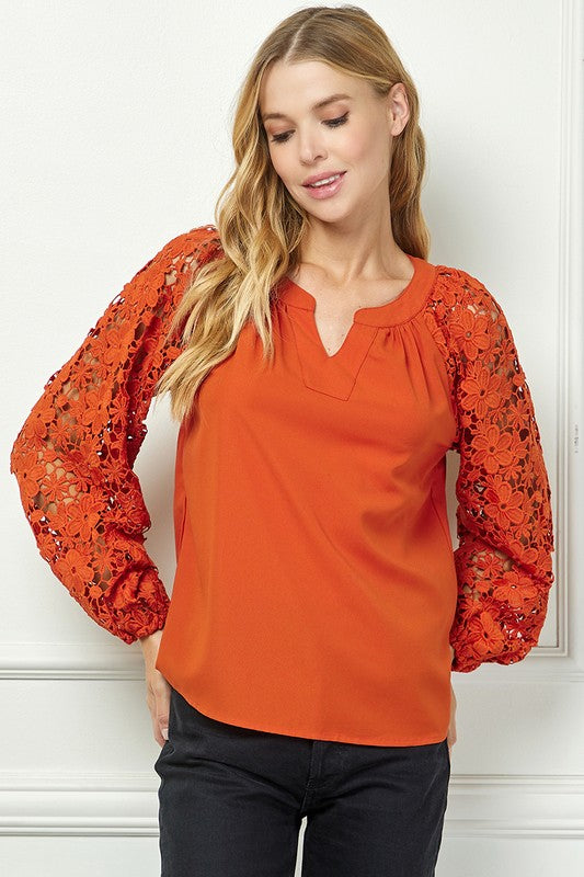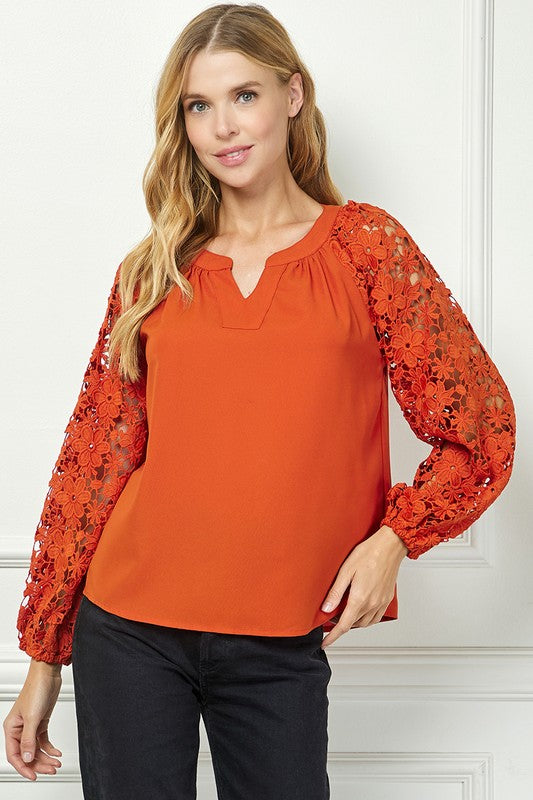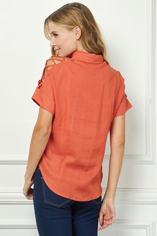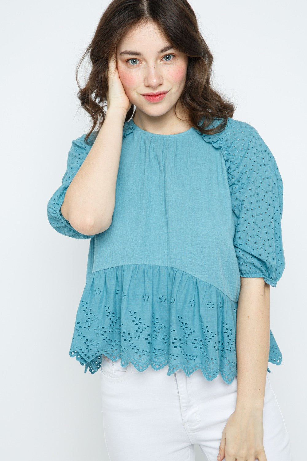 SOLID WAFFLE KNIT ROUND NECK LACE DETAILED TOP