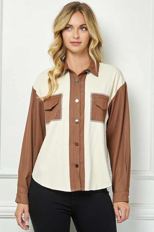 SATIN LONG SLEEVE BLOUSE-RHINESTONE EMBELLISH