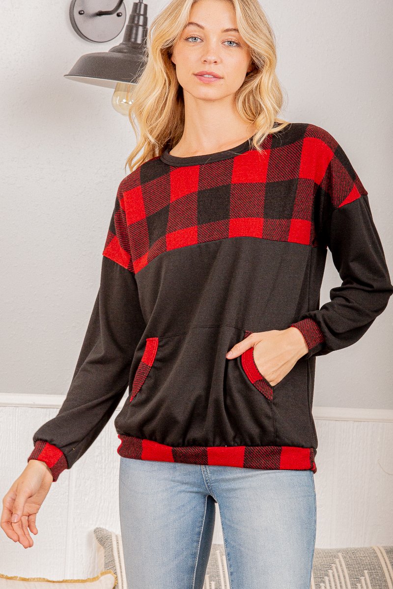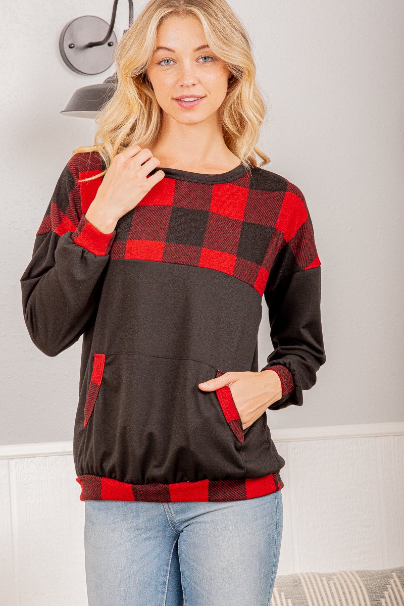 RED/BLACK PLAID PRINT W/ KANGAROO POCKET DETAILED TOP HMST2097-11